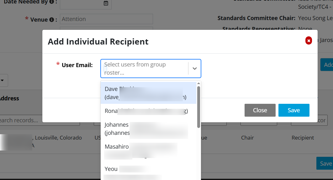 - To individually add recipients, click on Add Individual Recipient. Select a recipient from the list and click Save. It is required that the individual be in the Working Group roster with any involvement level.